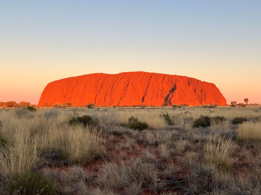 週末にウルル(エアーズロック)に行ってきました。シドニーから飛行機で3時間半、空港から無料バスで10分いくとエアーズロックリゾートに着きます。そこからでもウルルが見えますが、今回はガイドつきツアーでウルルのすぐ近くまで行きました。夕刻にはサンセットに照らされたウルルを見ながらシャンパンを飲むというのがセットになったツアーです。
